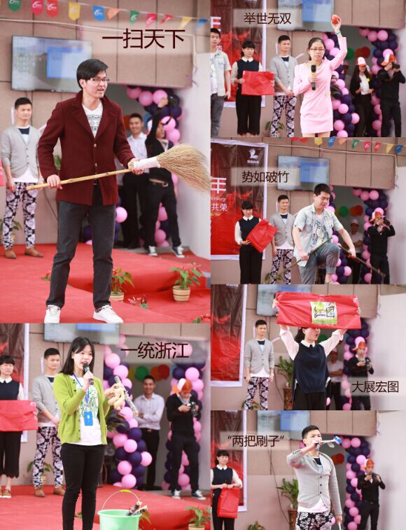 下面是技術部周年獻禮環節,聯欣技術部現在已經是六十余人的大團隊,這里的家人來自于祖國的五湖四海,我們帶著共同的夢想來到聯欣,為了這個共同的夢想而努力奮斗。技術部給聯欣獻上的第一份禮物是一首用河南話、重慶話、廣西話、溫州話、江西話、閩南話共同演繹的詩詞《聯欣,你正年輕》,說出太多人的心聲。聯欣,從2009年的十余人,發展到現在四百余人的大家庭,聯欣取得的每一份成績,都離不開這些來自五湖四海的家人們的共同努力與付出。他們用自己不同的家鄉話表達出對聯欣美好的祝愿,祝聯欣——一掃天下(一個掃把),一統浙江(一個水桶,里面乘著甘蔗和生姜),舉世無雙(一個西紅柿),勢如破竹(輕松折斷一根竹子),也祝聯欣的每一位伙伴每人都有兩把刷子(嘻嘻,是馬桶刷)。技術部用詼諧幽默的方式,表達出了對聯欣最美好的祝愿。